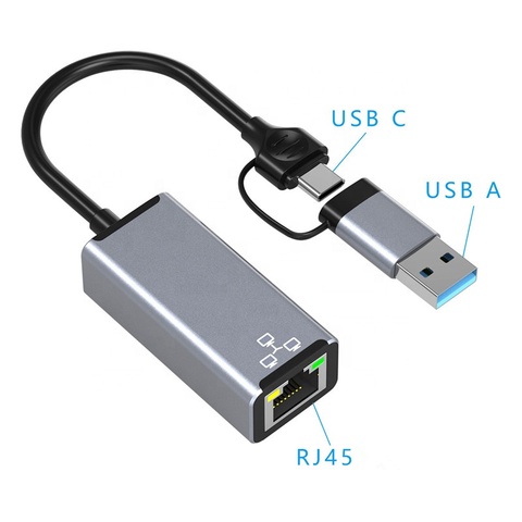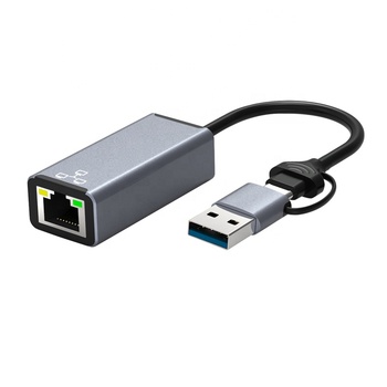 2 in 1 Type C / USB to 1000Mbps Gigabit RJ45 Ethernet Adapter Aluminum Alloy Network Card for Phone Laptop