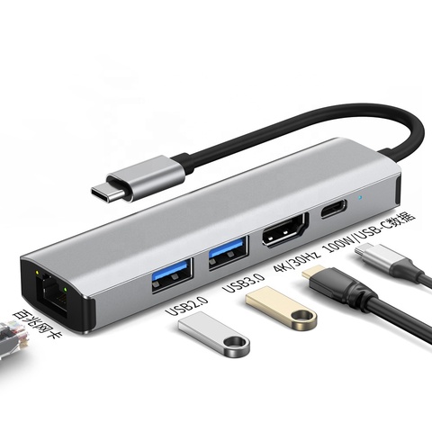 High Quality 5 in 1 USB3.0 Hub Type C Docking Station 4K 30Hz HDTV with RJ45 LAN Ethernet Type-c Splitter Adapter